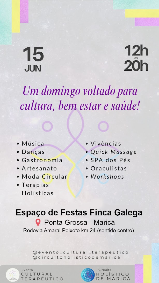 Em um local aprazível e com total segurança, o EVENTO CULTURAL TERAPÊUTICO, reunirá o que de melhor existe em Maricá nas áreas de Artesanato, Terapias Holísticas, Moda Circular, Oraculistas, Spa dos Pés, Quick Massage e Gastronomia.